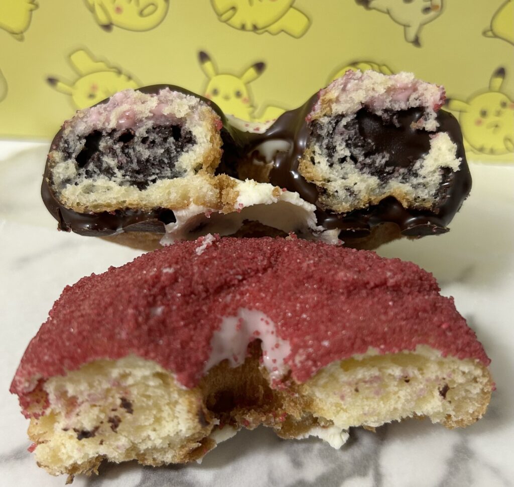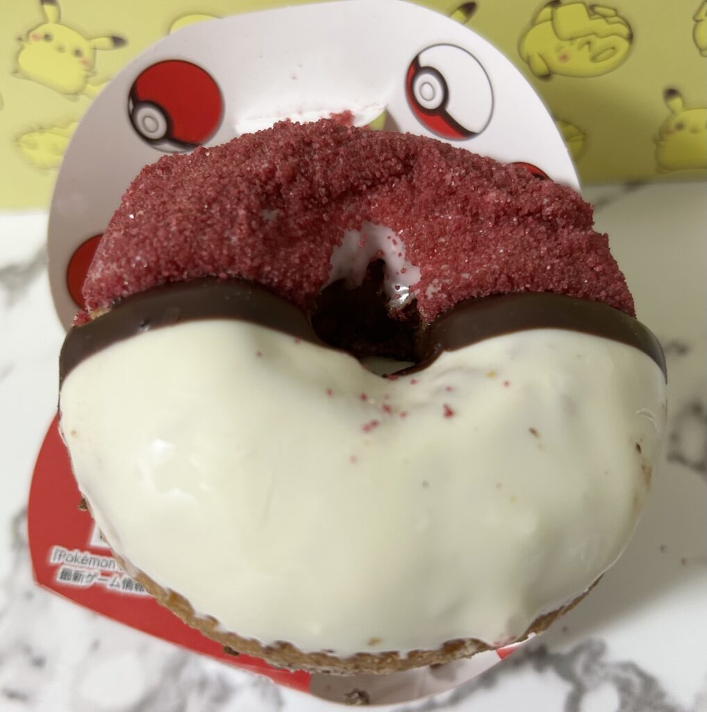 生地は、しっとりした優しい甘さなケーキドーナツで、ホワイトチョコの甘さと、ストロベリーチョコの甘酸っぱさを一度に感じられる大人な味わい。