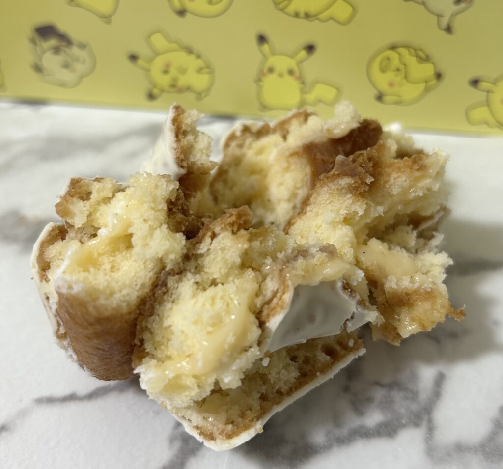 先ほどの、ドーナツとの違いは、コーティングがチョコレートかホワイトチョコレートかでした! ホワイトチョコレートとカスタードクリームとの相性も抜群。